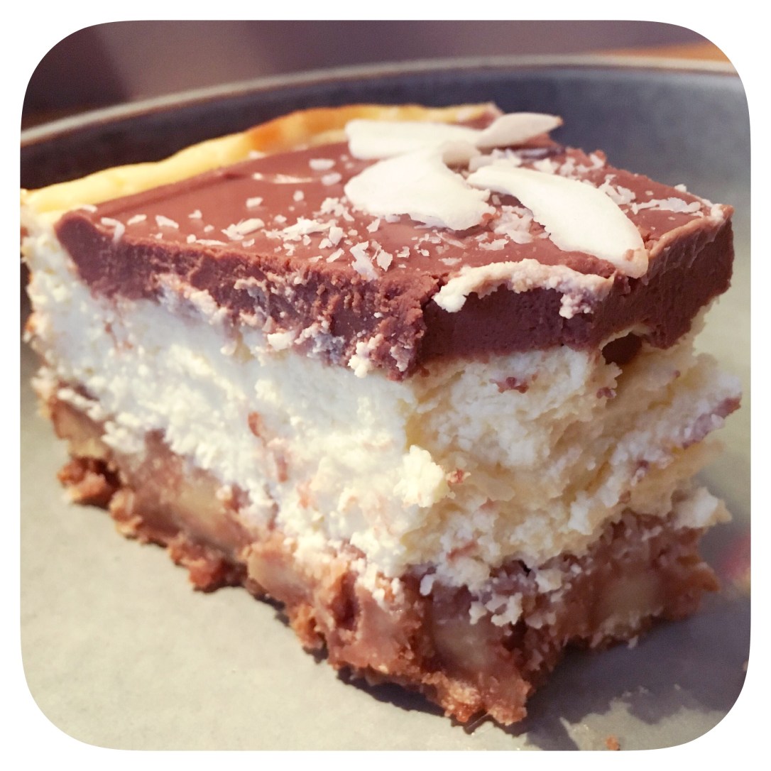 Pour le glaçage : Dans une petite casserole, faire chauffer la crème de coco. Ajouter le chocolat couper en carrés et faire fondre doucement. Hors du feu, ajouter le beurre et bien remuer. Laisser un peu refroidir. Verser le glaçage sur votre cheesecake, lisser avec une spatule et hop, de nouveau au frigo pour figer votre glaçage.