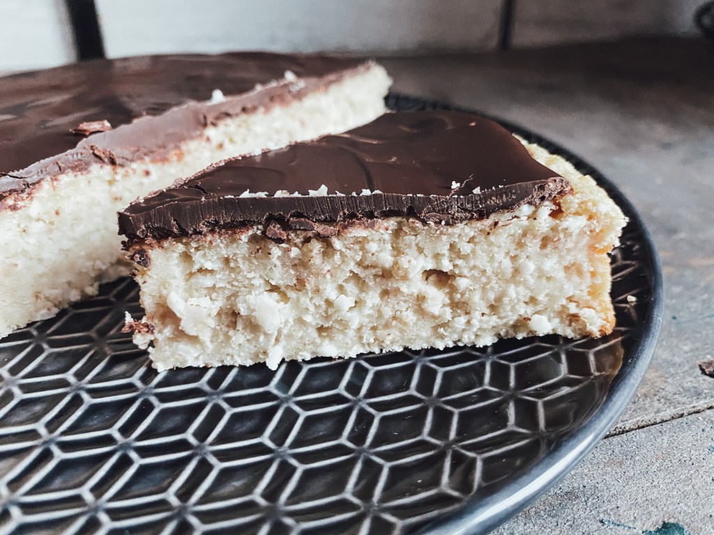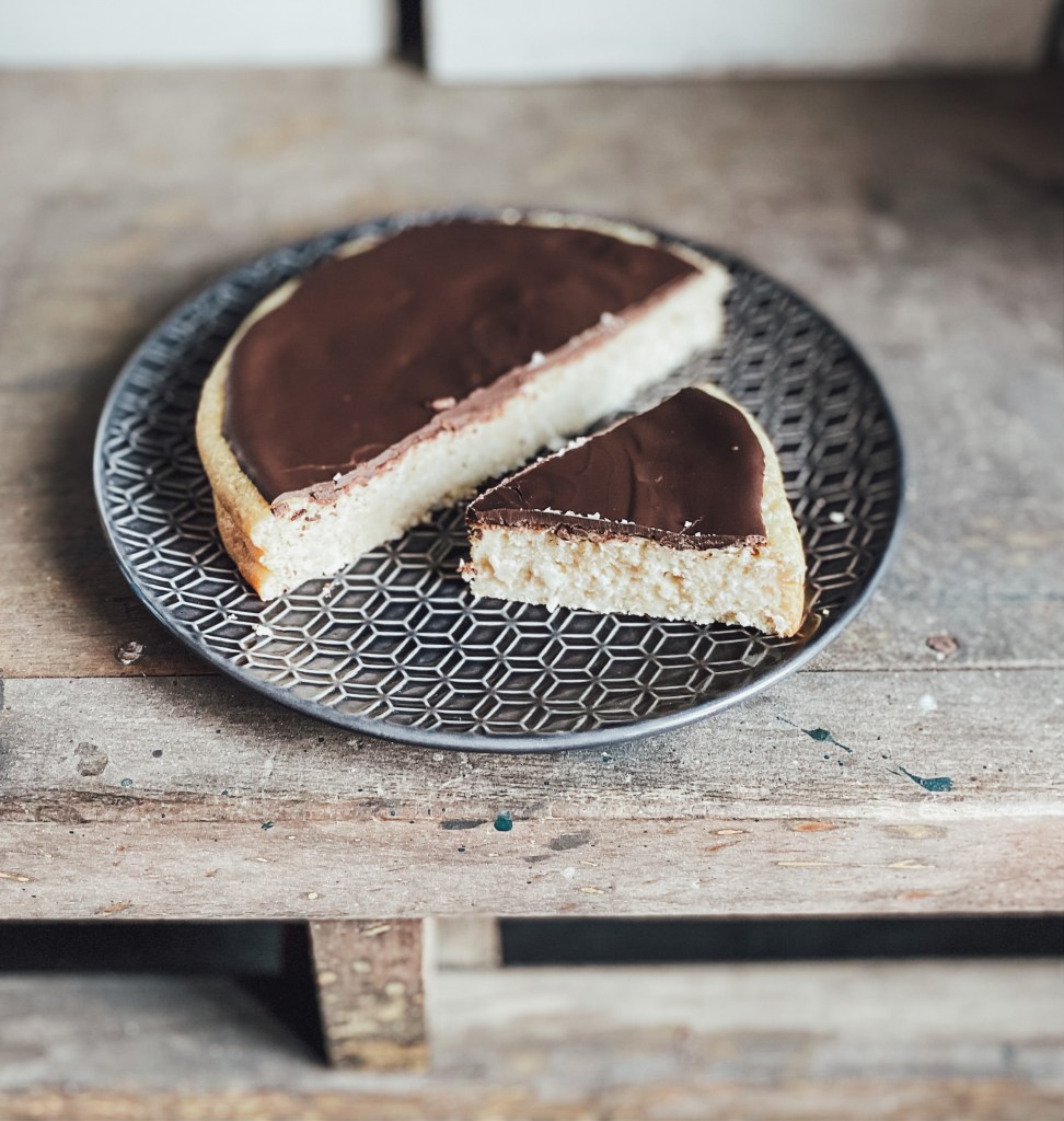 Quand le gâteau a bien refroidi, faire fondre le chocolat et l’huile de coco au micro-ondes dans un p’tit bolichon puis verser le tout sur le dessus du gâteau.