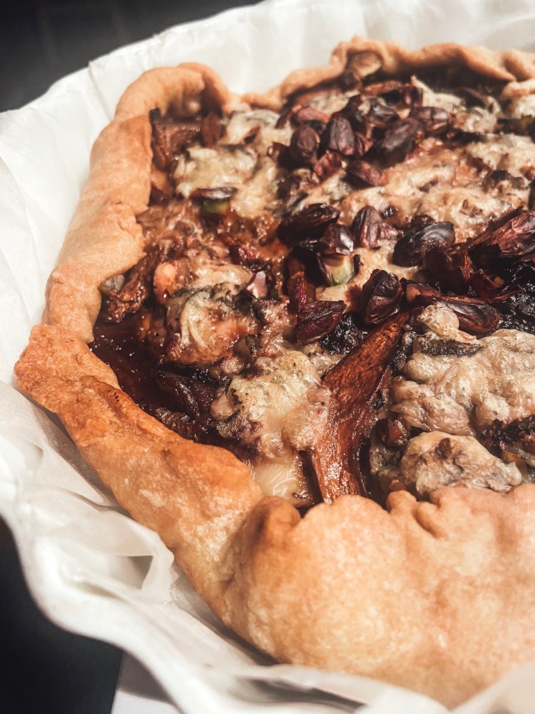 Etaler maintenant votre pâte ou ouvrer simplement le paquet et dérouler. Foncer votre moule à tarte et piquer la pâte à l’aide d’une fourchette. Déposer au fond les oignons, puis les champignons par-dessus. Emietter le gorgonzola avec vos petits bois et le répartir un p’tit peu partout sur votre tarte. Parsemer le tout de pistaches (sans la coquille on est bien d’accord hin ?!)
