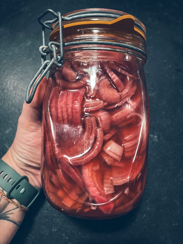 Revenons en à nos oignons. Parce que à la base, j’étais venue pour ça. Vous parler de mes oignons. Mes pickles d’oignons rouges plus précisément. Chose merveilleuse que j’ai découvert il y a peu et dont, je ne peux, actuellement, plus me passer. Ce petit ingrédient un peu acide et sucré en même temps. Mioum. Sur des toasts avec des œufs brouillés au cheddar ou dans une salade, c’est ma découverte de fin d’année 2023 et je me devais de partager ça avec vous.